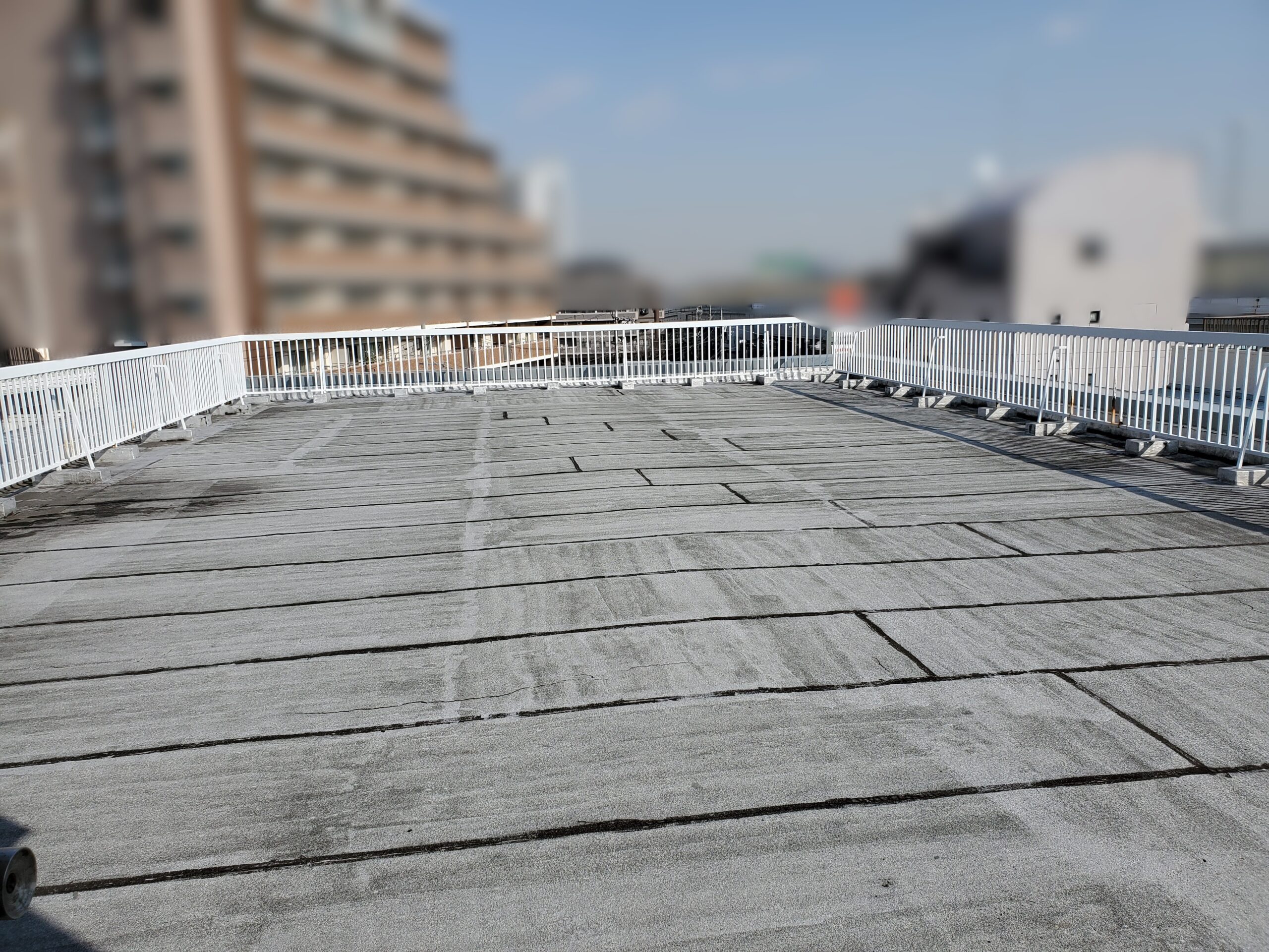 本工事は、商業施設屋上の既存防水層(露出アスファルト防水)が経年劣化により表面のひび割れや剥離が進行していたため、改修を行ったものです。長年の紫外線や気温変化の影響でアスファルト層が硬化し、部分的に防水性能が低下していました。