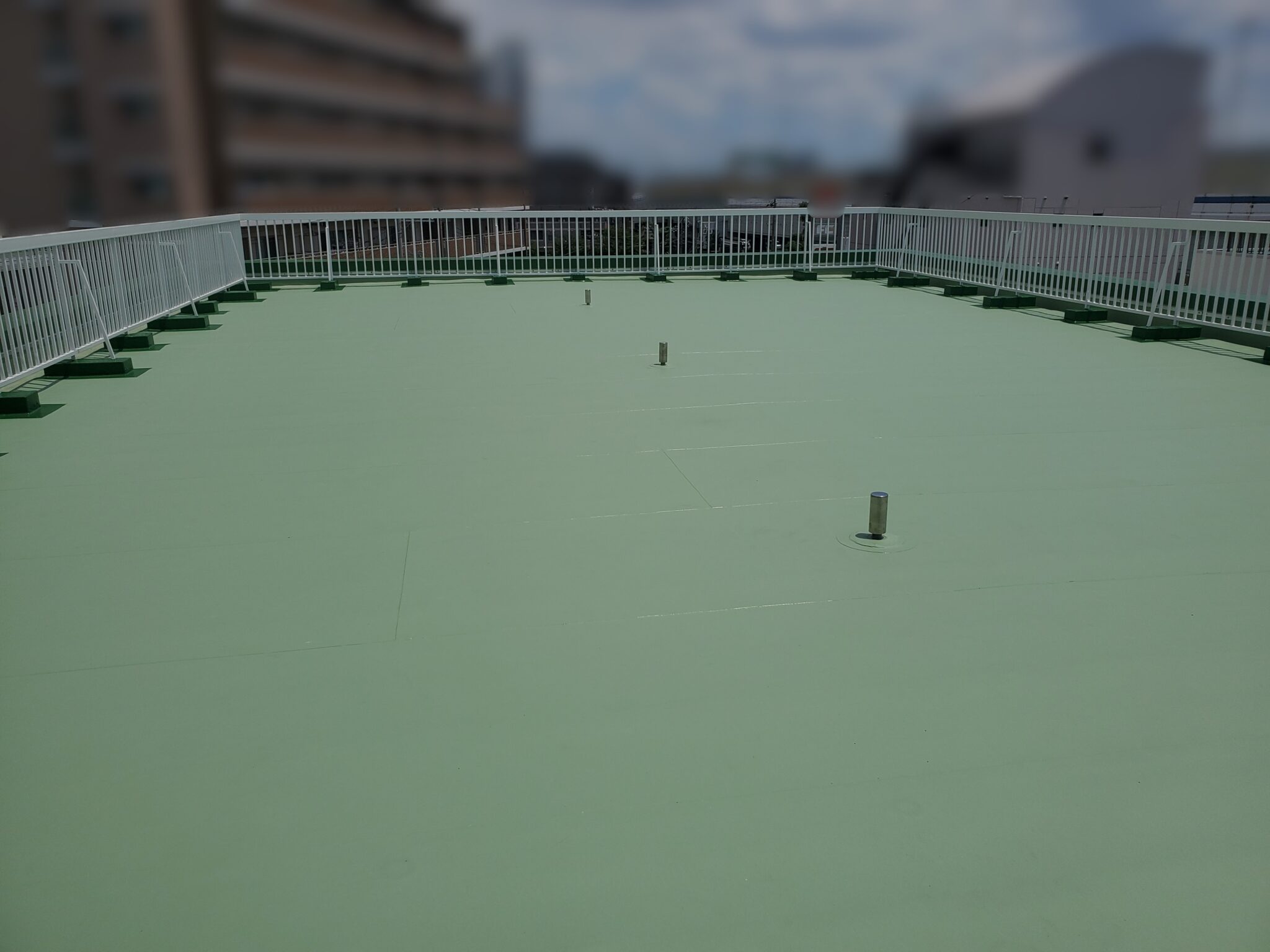 施工完了後の屋上は、緑色の防水シートが美しく仕上がり、防水性・耐候性・耐久性ともに大きく向上しました。露出アスファルトから塩ビシート防水への更新により、軽量でメンテナンスしやすい屋上となり、長期間にわたって安心して使用できる環境が整いました。
