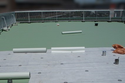 施工では、まず既存防水層の清掃と下地処理を行い、固定ディスクを等間隔に設置。その上に塩ビシートを敷設・溶着して、一体化した防水層を形成しました。シートの継ぎ目は熱融着により完全に密封し、雨水の浸入を防ぐ構造としています。